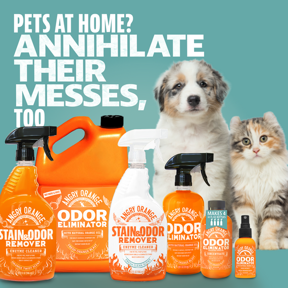 Angry Orange works perfectly both on pee stains and to eliminate the nasty smells that linger around the house from your pets. The Odor Eliminator line is designed to tackle on bad smells exclusively, while the Scented Enzyme Stain Cleaner eliminates stains.