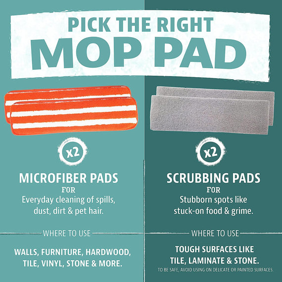 - 2 SETS OF PADS - Accidents happen – but no matter the mess, our mop pads can handle it. Use the microfiber set for everyday messes, and the scrubber set for stains and spills that need a little more effort.